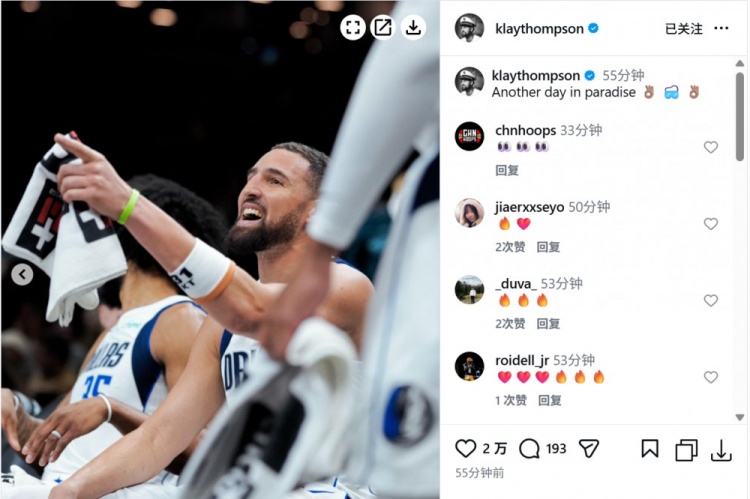 球队迎来两连胜。赛后,克莱发文庆祝比赛胜利:“又是美好的一天。”