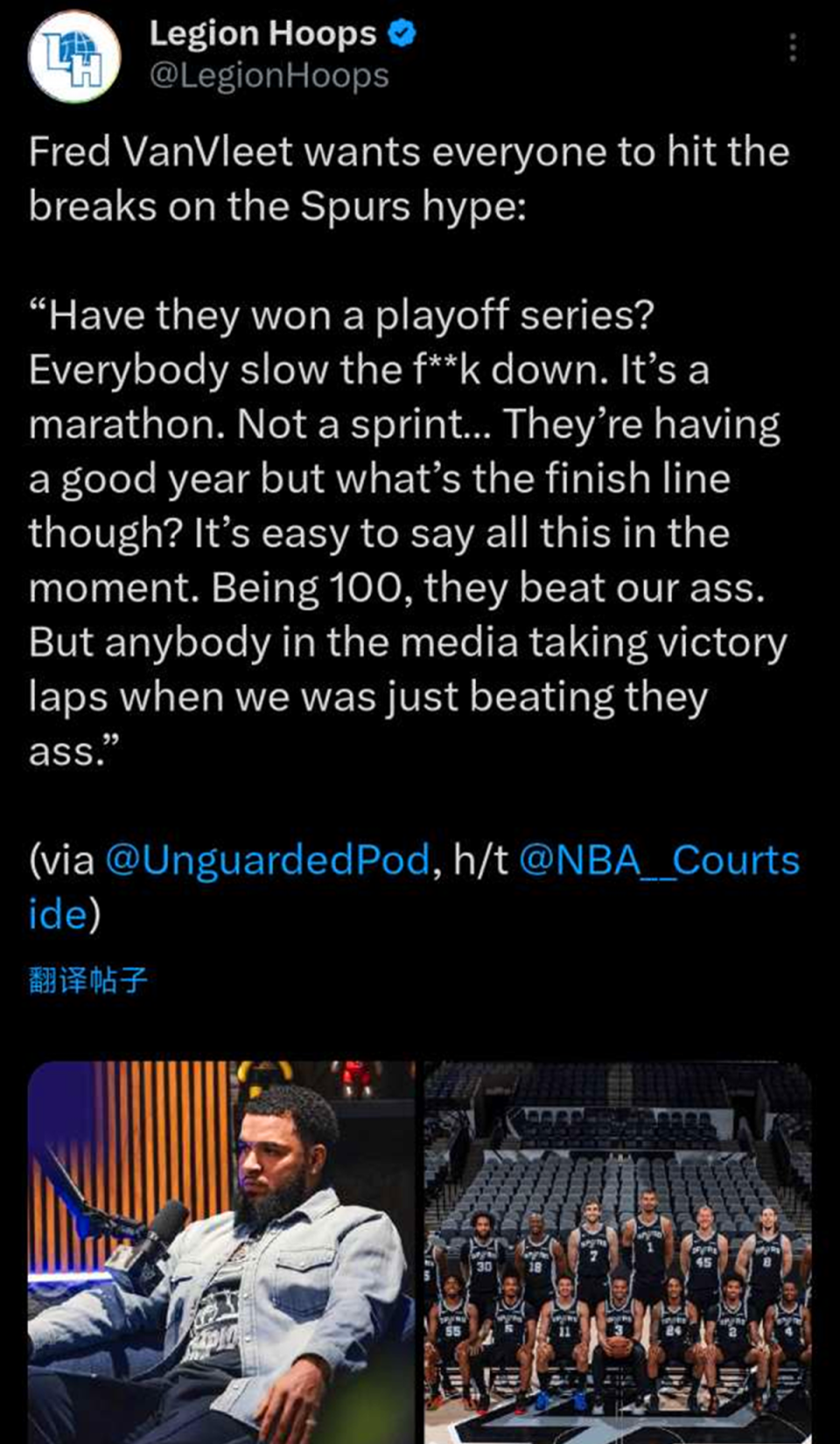 由于遭遇十字韧带撕裂大伤,范乔丹在养伤期间开启同名个人播客节目《Fred VanVleet》锐评联盟热点事件,本赛季状态火爆的马刺队自然成为其讨论的话题之一。